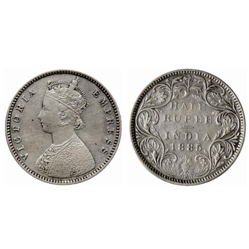 Victoria Empress, Silver ½ Rupee, 1885, Bombay Mint, A/II, B raised. Center vertical stroke in top flower is long and thick. GK 630.