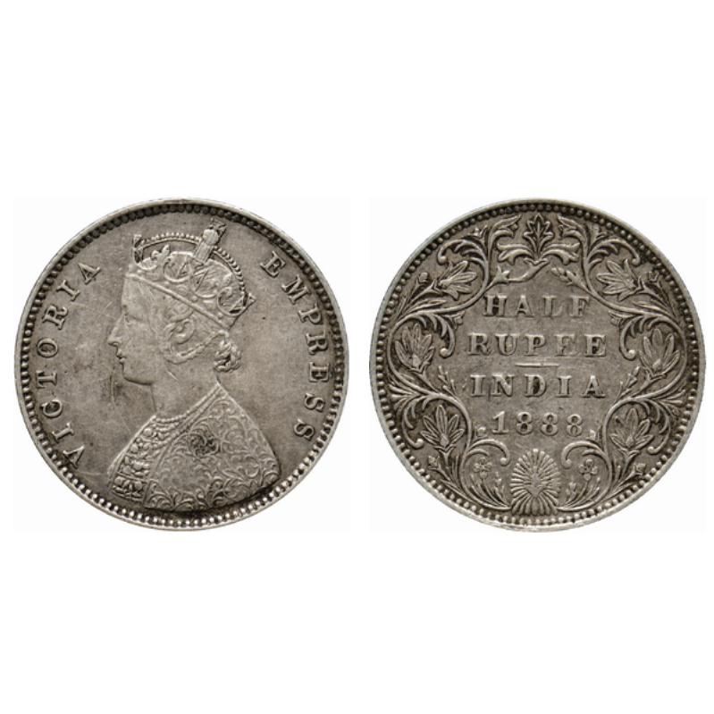 Victoria Empress, Silver ½ Rupee, 1888, Bombay Mint, A/II(i), no mint mark without B, Center vertical stroke in top flower is short and thin. GK 638.