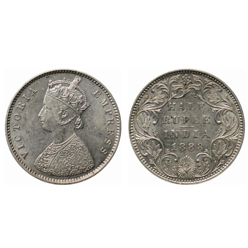 Victoria Empress, Silver ½ Rupee, 1888, Bombay Mint, A/2, big B raised. GK 640.