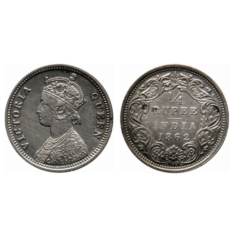 Victoria Queen, Silver ¼ Rupee, 1862, Bombay Mint, A/1, raised inverted 'V' on obverse, no mint mark. GK 377.
