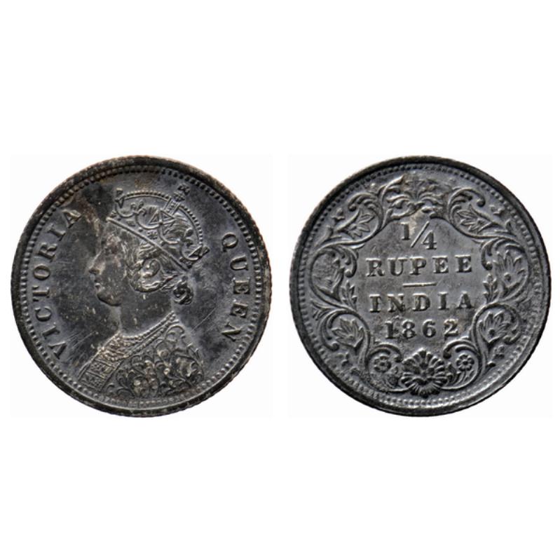 Victoria Queen, Silver ¼ Rupee, 1862, Bombay Mint, A/1, raised inverted 'V' on obverse, no mint mark. GK 377.