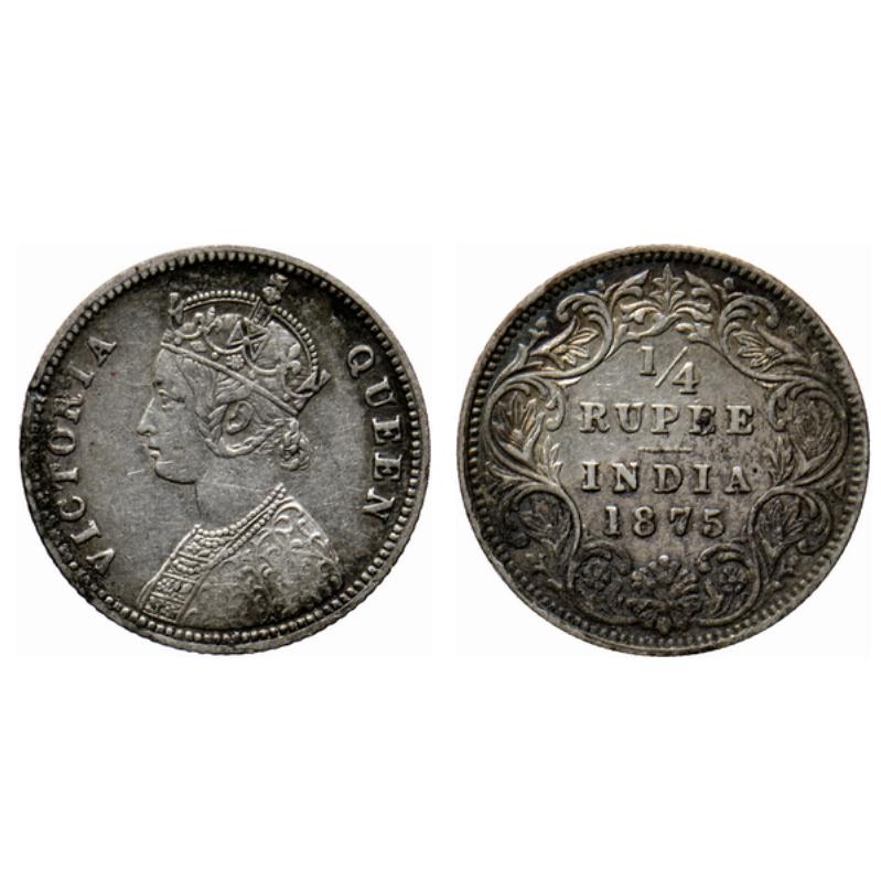 Victoria Queen, Silver ¼ Rupee, 1875, Calcutta Mint, A/I, no mint mark. GK 667.