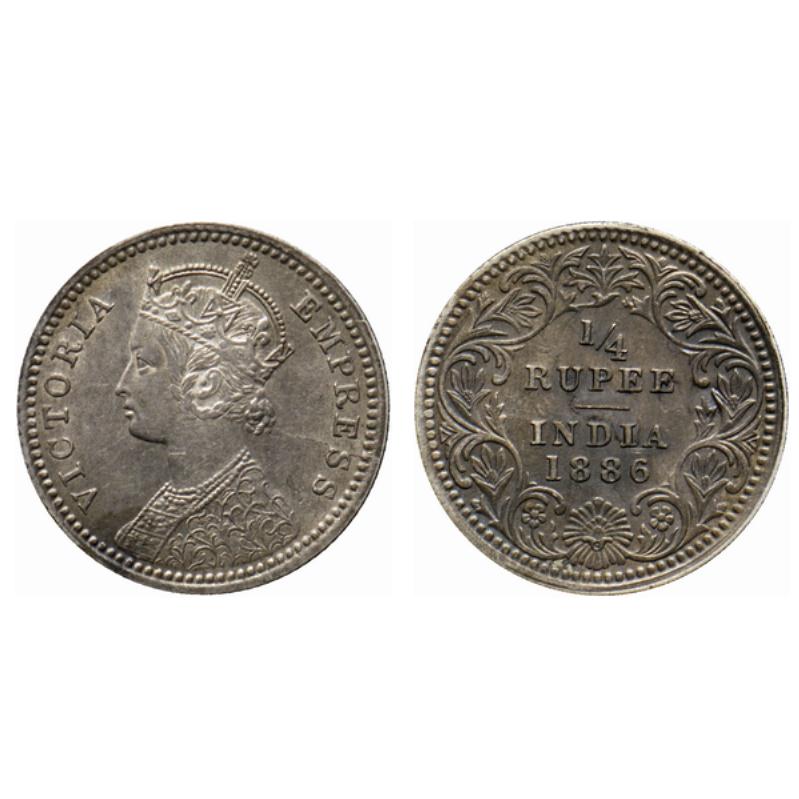 | Victoria Empress, Silver ¼ Rupee, 1886, Calcutta Mint, C/II, C incused, ghost on reverse, die crack on obverse, 'Empress' double struck. GK 707. |