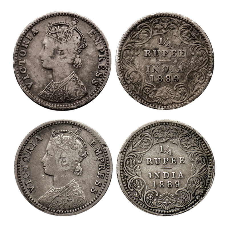 Victoria Empress, Silver ¼ Rupee (2 Coins), 1889, Bombay Mint, C(i)/II, 'B' incused. Calcutta Mint C/II 'C' incused. GK 715, 716.