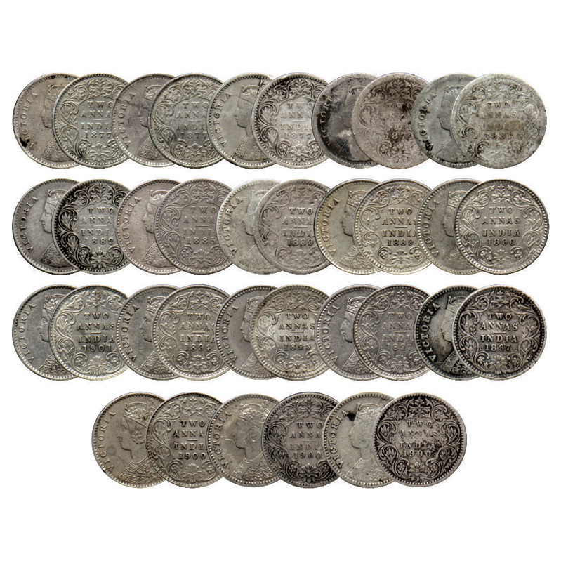 | Victoria Queen/Empress, Silver 2 Annas (18 Coins), 1874 Bombay Mint A/I no mint mark, no dot, 1877 Bombay Mint A/I (3 Coins), 1881 Bombay Mint A/II dot, 1882 Bombay Mint A/I dot, 1885 Bombay Mint A/I 'B' raised, 1889 Bombay Mint B/II 'B' incused (2 Coins) |