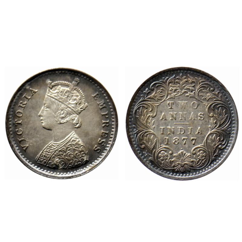 Victoria Empress, Silver 2 Annas, 1877, Bombay Mint, A/I, dot. GK 746. ...