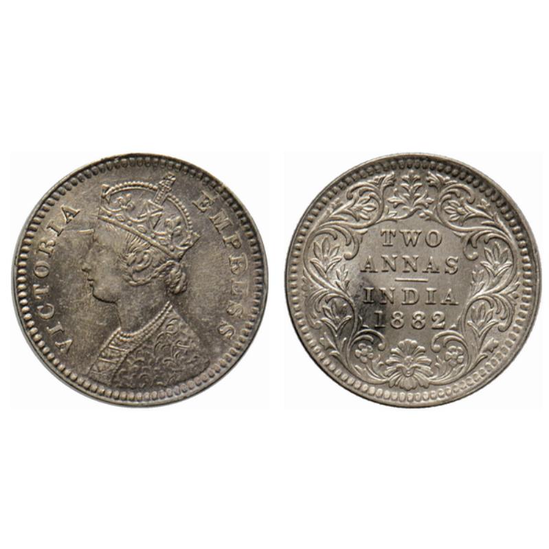 Victoria Empress, Silver 2 Annas, 1882, Calcutta Mint, B/II, C incused at bottom. Ghost on Reverse and Obverse. GK 673.
