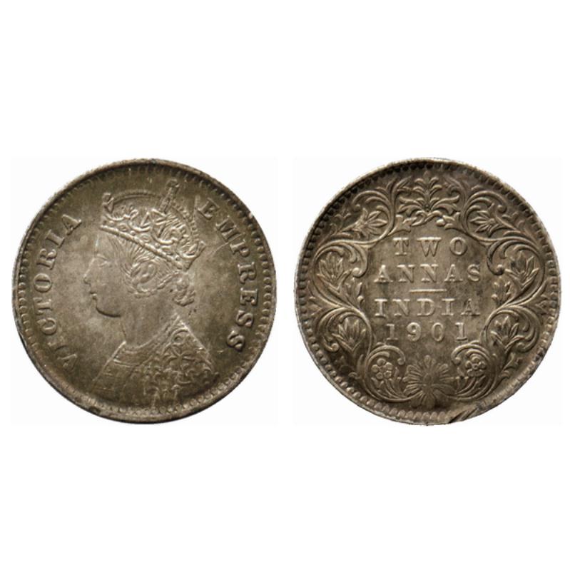 Victoria Empress, Silver 2 Annas, 1901, Bombay Mint, B/I, B incused. GK 816.