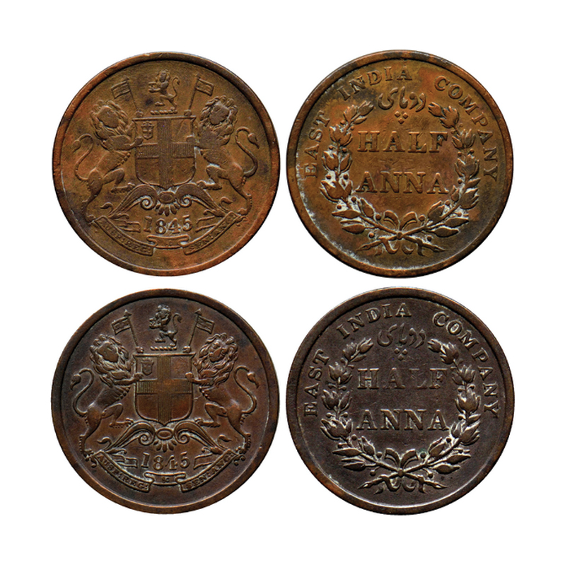 Victoria Queen, Copper Half Anna (2 Coins), 1845 Calcutta Mint, (i) obverse A, cross bar of numeral 4 of year 1845 with serif pointing upwards, broken 4 of year date 1845. (ii) obverse B, cross bar of numeral 4 of year 1845 without serif. GK 144, 145.
