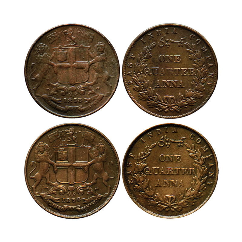 Victoria Queen, Copper Quarter Anna (2 Coins), 1858 Heaton Mint, wreath top tips ends with Two leaves and other with single leaf year numerals closer to the above five line design. GK 233, 231.