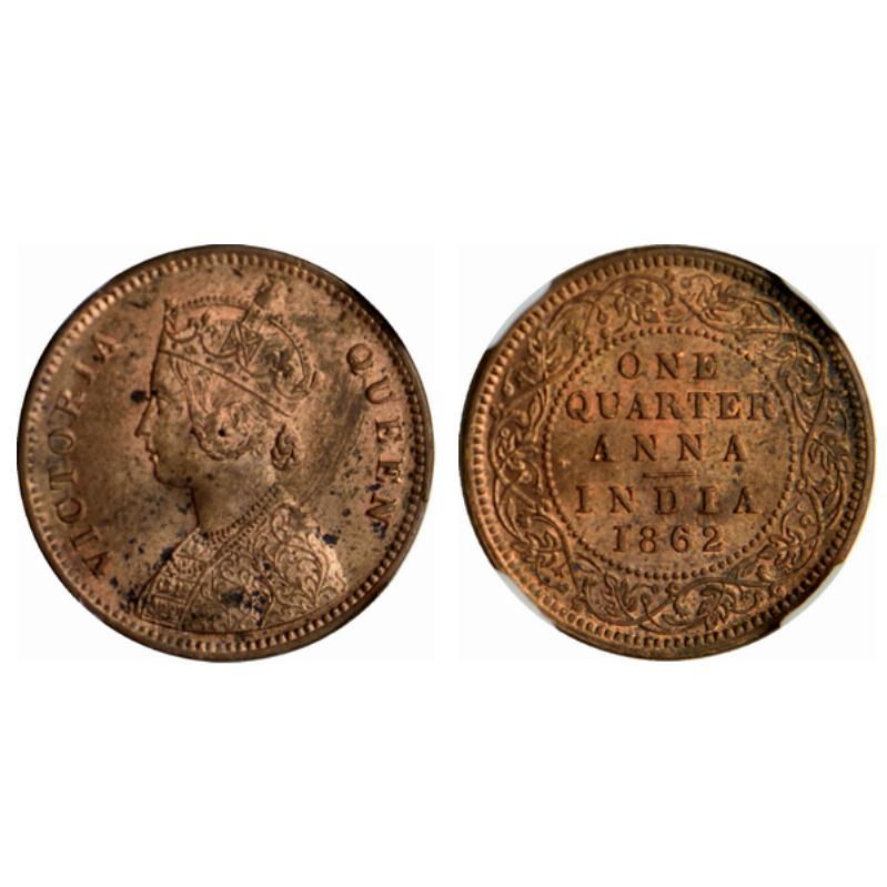 Victoria Queen, Copper Quarter Anna, 1862, Calcutta Mint, A/I. F.Prid. 601.