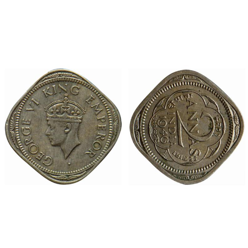 George VI, Copper Nickel 2 Annas, 1946 Calcutta Mint, Type II, no dots by year. Reverse die at 3 o'clock. GK 1371.