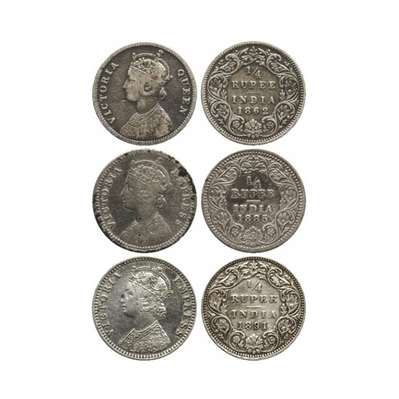 Victoria Queen / Empress, Silver, ¼ Rupee (3 Coins), 1862 (Cal) A/I, 1885 (Cal) C/II 'C' incused, 1891 (Bom) C(i)/I 'B' incused. GK 375, 702, 720.