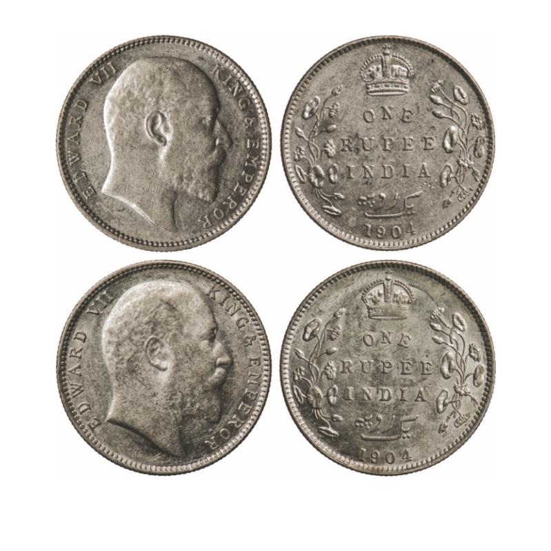 | Edward VII, Silver, Rupee (2 Coins), 1904, Bombay Mint, 'B' incused, Dot, 5 diamonds, Bottom stroke of numeral '4' long. GK 933. |