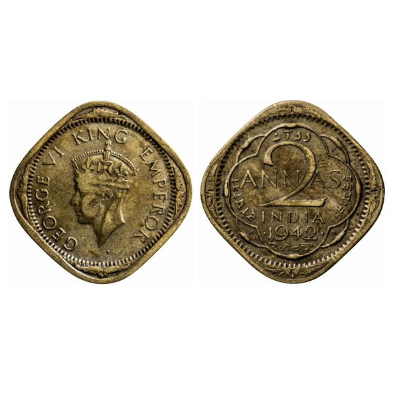 George VI, Brass-Nickel, 2 Annas, 1942, Head type II, Dots by year, Small numeral '4'. GK 1358.