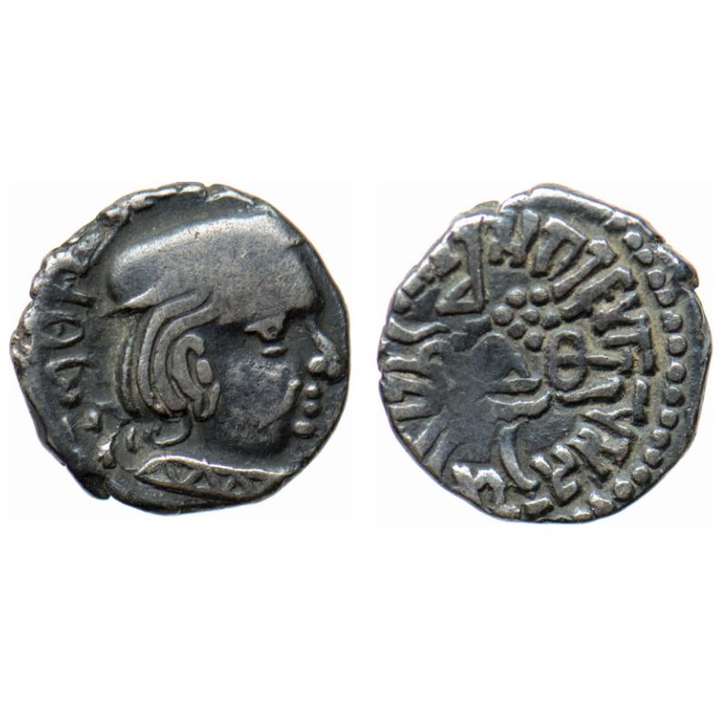 | Western Kshatrapas, Visvasena s/o Bhartrdaman (c. 292-304 AD), silver Drachma, 1.80gm, SE 225, Obv: Bust of king facing to right, date digit behind, Rev: Three arched hill with crescent in center, moon to left and sun to right, Brahmi legend in Prakrit Rajno Mahakchatrapasa Bhartrudamnaputrasa Rajno Kchatrapasa Vishvasenasa. A. M. Fishman 30.5.225. Very Fine, Scarce. |