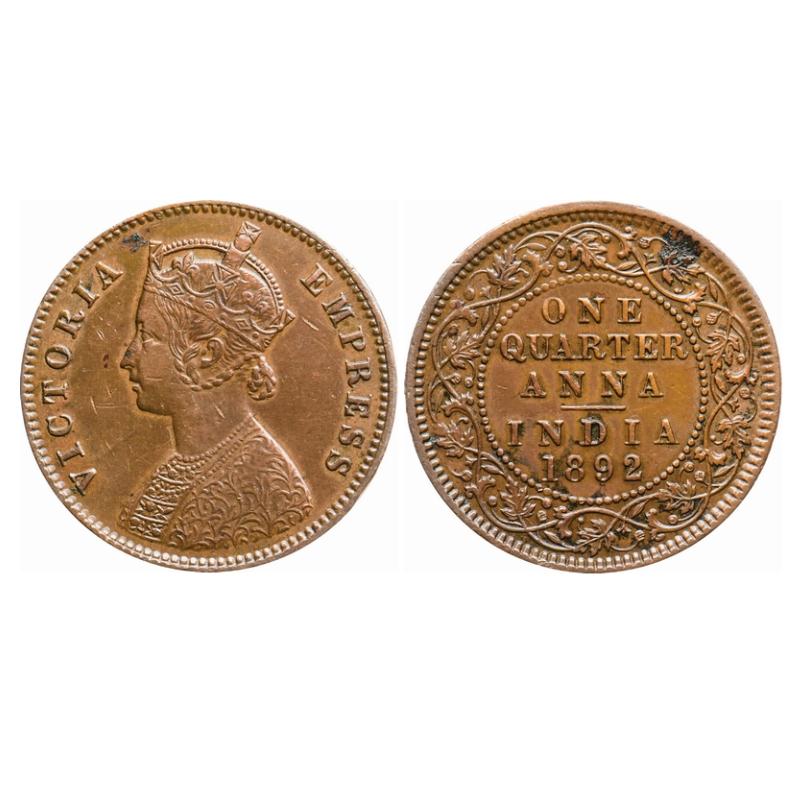 Victoria Empress, Copper Quarter Anna, 1892, Calcutta Mint, B/II, No mint mark, Ghost on Reverse, letter 'I' and 'N' of INDIA are prominently seen on the Obverse. GK 851. Extremely Fine. Scarce.