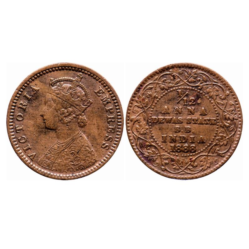 Dewas Senior Branch, Copper 1/12 Anna, 2.07g, Narayan Rao, AD 1888. Crowned bust of Victoria on obv. KM 11. Very Fine+, Scarce.