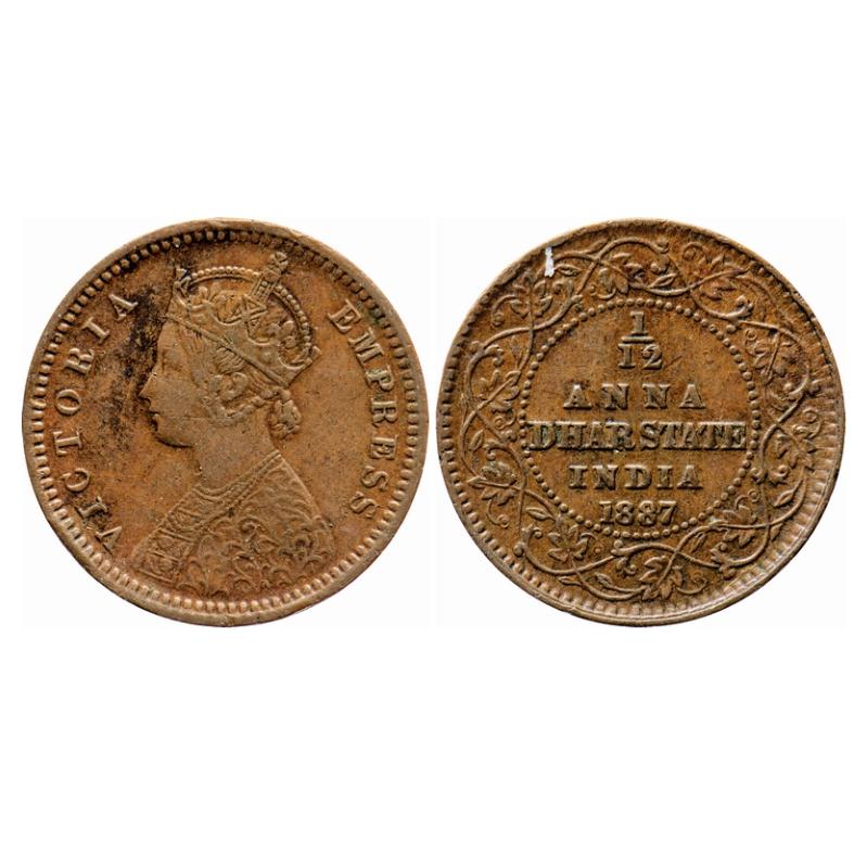 Dhar, Copper 1/12 Anna, 1.96g, Anand Rao III, AD 1887, bust of Victoria Empress on obv. KM 11. Very Fine+, Scarce.