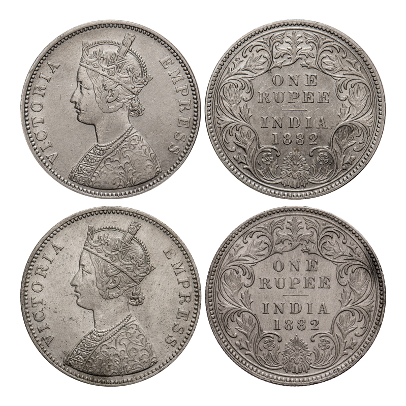 | Victoria Empress, Silver, Rupee (2 coins), 1882, Bombay Mint, 1) A3/I, Dot, 2) A3/I, Dot, 1'o clock die rotation on Obv. F. Prid # 160. GK 474. About Extremely Fine to Extremely Fine+. Scarce. |