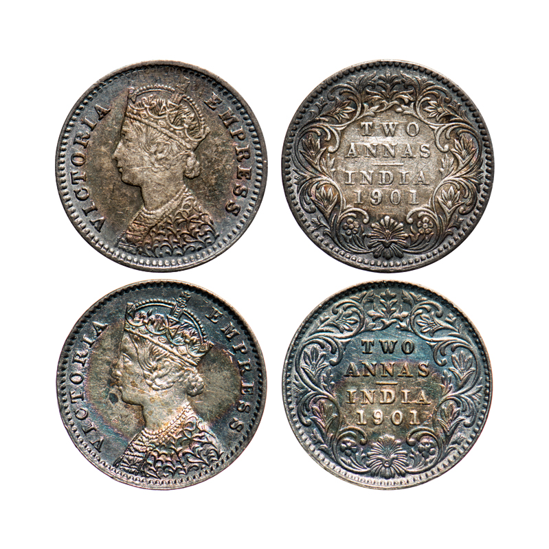 | Victoria Empress, Silver, 2 Annas (2 coins), 1901, 1) Bombay Mint, B/I, 'B' incused, 2) Calcutta Mint, B/II, 'C' incused. F. Prid # 555, 515. GK 816, 817. Very Fine+ to Uncirculated. Scarce. |