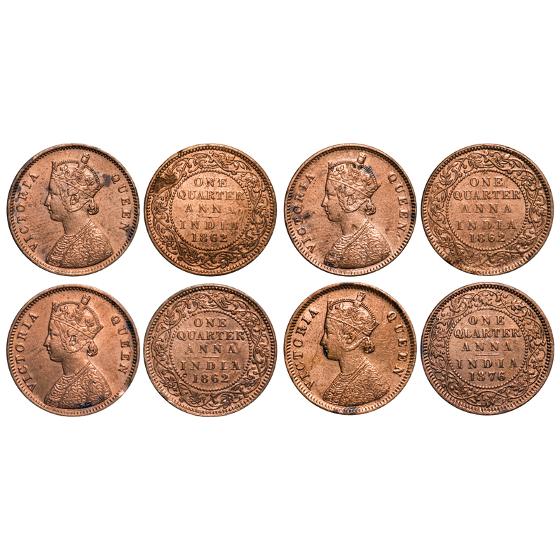 | Victoria Queen, Copper, Quarter Anna (4 coins), 1) 1862, Calcutta Mint, A1/I, No mint mark, Tiny 'V' raised, 2) & 3) 1862, Bombay Mint, A/I, Tiny 'V' incused at the right side bottom point of the shoulder, 4) 1876, Calcutta Mint, B/II, No mint mark. F. Prid # 601, 602, 602, 610. GK 395, 397, 397, 827. Extremely Fine to Extremely Fine+, Cleaned. Scarce. |
