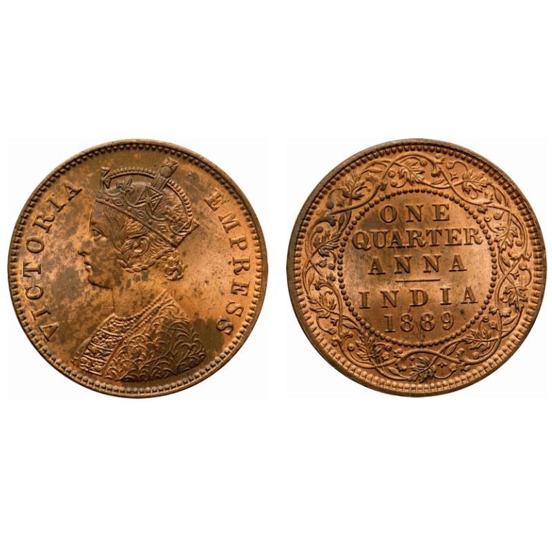 Victoria Empress, Copper, Quarter Anna, 1889, Calcutta Mint, B/II, No mint mark. F. Prid # 622. GK 848. Uncirculated, Details. Scarce.