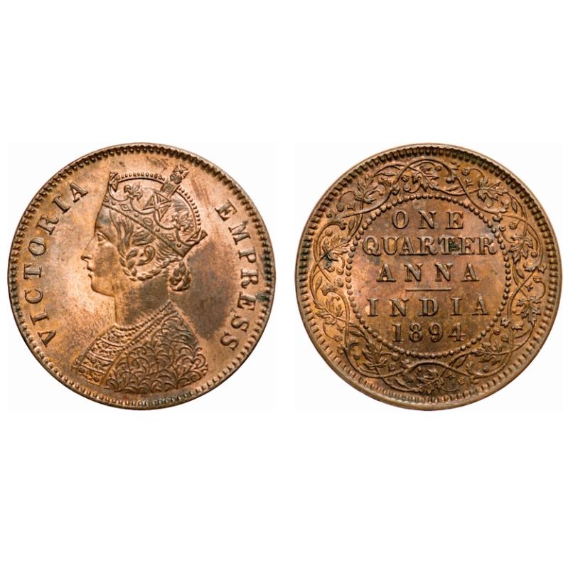 | Victoria Empress, Copper, Quarter Anna, 1894, Calcutta Mint, B/II, No mint mark, Partial ghost on Rev. F. Prid # 627. GK 853. Almost Uncirculated, Details. Scarce. |