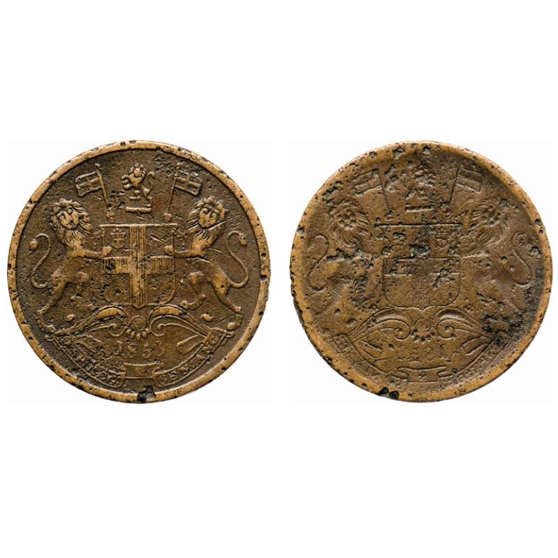 | Victoria Queen, Copper, 1/2 Pice, 1853, (2.90 g) (21.22mm), Calcutta Mint, Obv B, Rev 1, Error, Obv Lakhi/Brockage. F. Prid # 159. GK 235. Very Fine. Rare. |