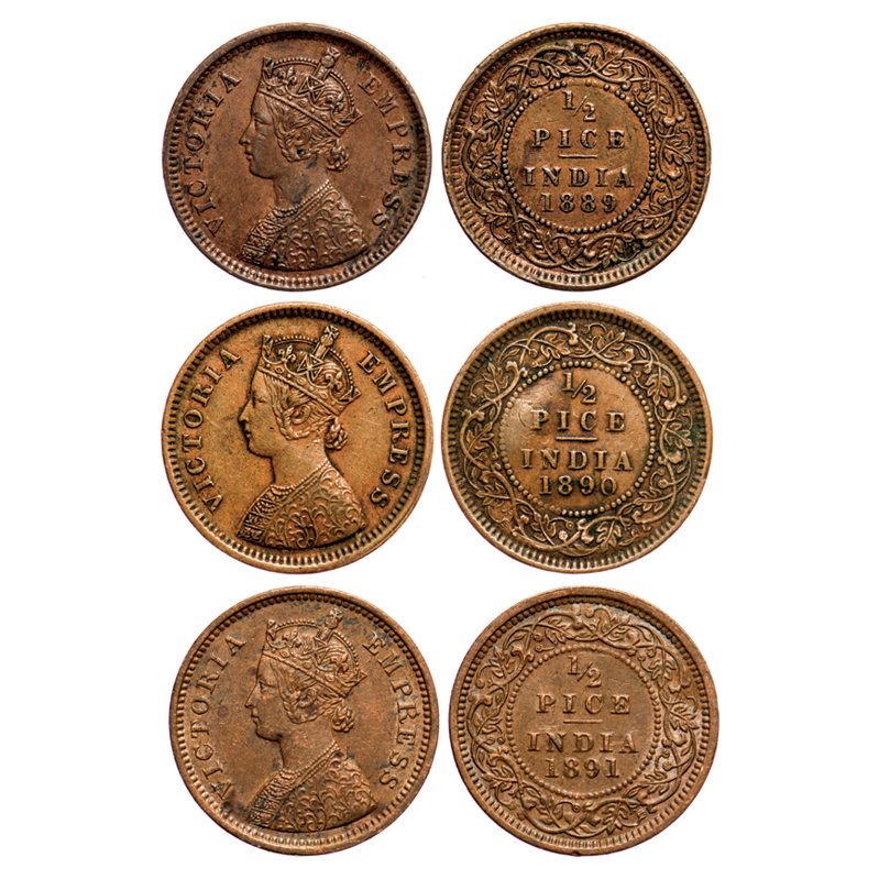 | Victoria Empress, Copper, 1/2 Pice (3 coins), Calcutta Mint, A/I, No mint mark, 1) 1889, Ghost on Rev, 2) 1890, 3) 1891, Ghost on Rev. F. Prid # 721, 722, 723. GK 869, 870, 871. Very Fine+ to Extremely Fine. Scarce as a lot. |
