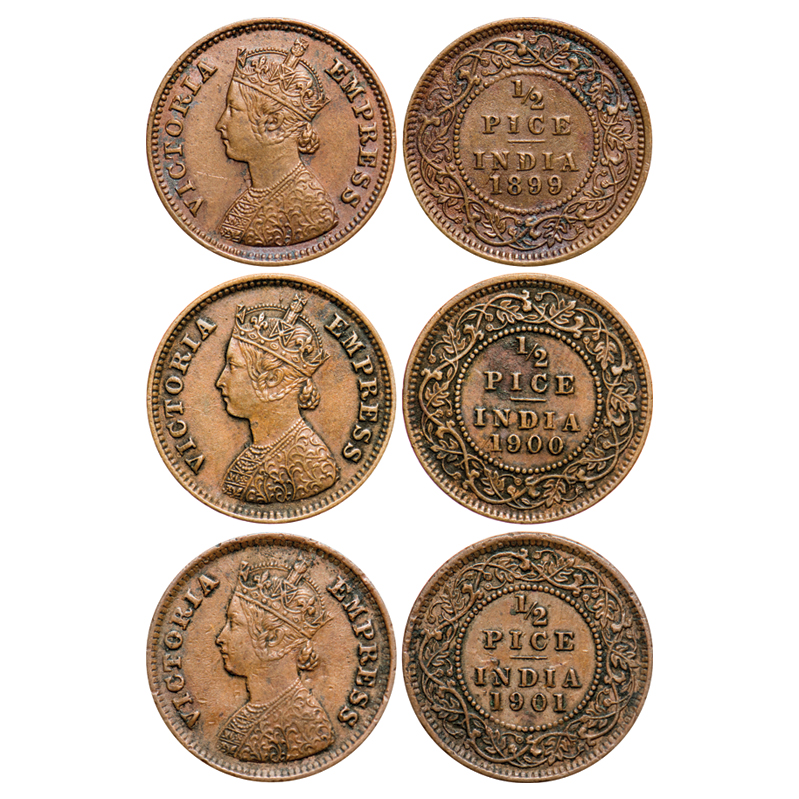 | Victoria Empress, Copper, 1/2 Pice (3 coins), Calcutta Mint, A/I, No mint mark, 1) 1899, Ghost on Rev, 2) 1900, 3) 1901, Letter 'I' & 'A' of India prominently seen on Obv. F. Prid # 732, 733, 734. GK 879, 880, 881. Very Fine to Very Fine+, Details. Scarce as a lot. |