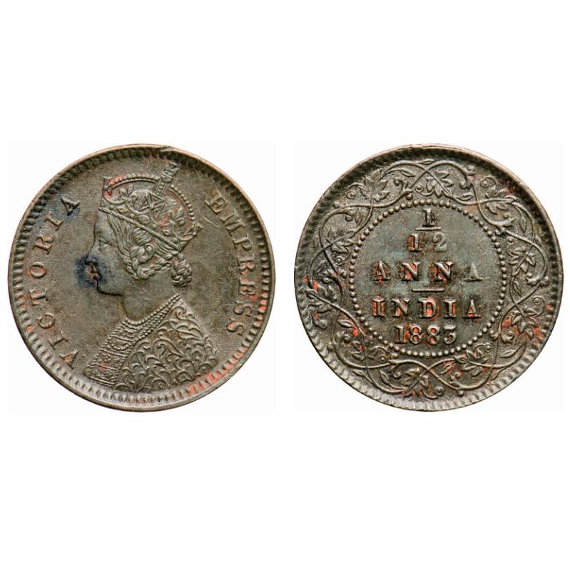Victoria Empress, Copper, 1/12 Anna, 1883, Calcutta Mint, Obv B, 'C' incused. F. Prid # 789. GK 896...