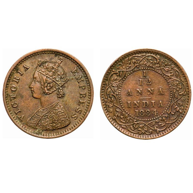 | Victoria Empress, Copper, 1/12 Anna, 1884, Bombay Mint, Obv A, No mint mark, Die crack on Obv. F. Prid # 812. GK 898. Extremely Fine, Details. Scarce. |