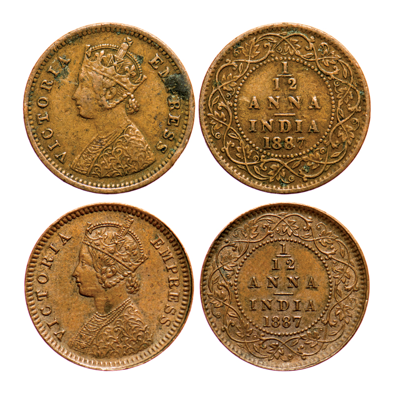 | Victoria Empress, Copper, 1/12 Anna (2 coins), 1887, 1) Bombay Mint, Obv A, No mint mark, 2) Calcutta Mint, Obv B, 'C' incused. F. Prid # 814, 792. GK 904, 905. Very Fine, Details to Extremely Fine+. Scarce. |