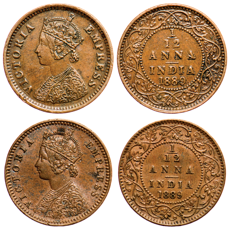 | Victoria Empress, Copper, 1/12 Anna (2 coins), 1889, 1) Bombay Mint, Obv A, No mint mark, 2) Calcutta Mint, Obv B, No mint mark. F. Prid # 816, 794. GK 909, 910. Very Fine+, Details. Scarce. |