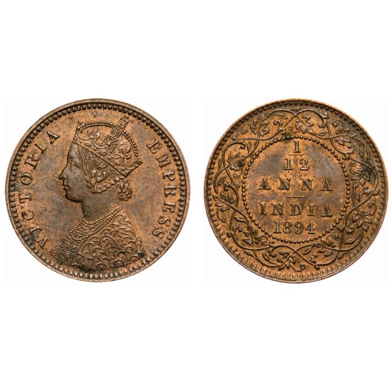 Victoria Empress, Copper, 1/12 Anna, 1894, Calcutta Mint, Obv 'B', No mint mark. F. Prid # 799. GK 915. Extremely Fine+. Scarce.