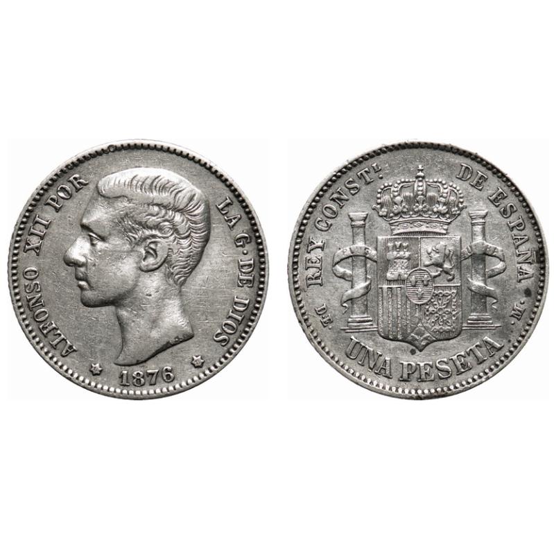 Spain, Silver (0.9030 silver), 4.91g, Ruler- Alfonso II (1874-1885 AD), Peseta 1876 DE-M, Obv: Bust to left, Rev: Coat of Arms. KM 672. About Very Fine, Scarce.