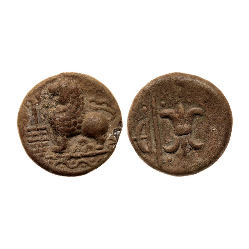 | Western Kshatrapas, Nahapana, Junnar Region, Lead unit, 9.06gm, Obv: Lion standing left in front of a Yupa in railing with 6 compartments, with three arched hill below, Rev: Thunderbolt, spear and bow. |