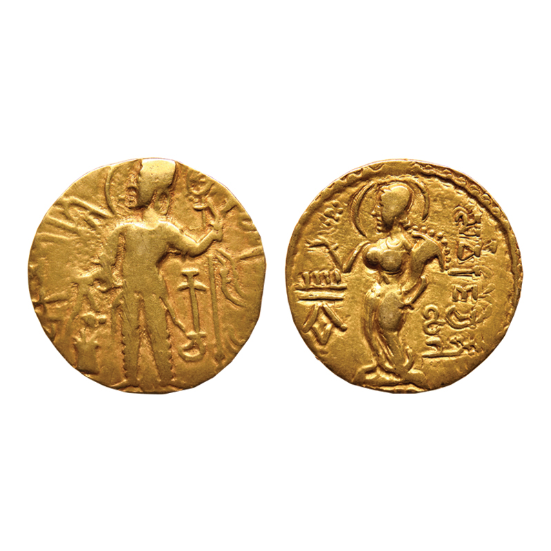 | Guptas, Samudragupta (c. 330-370 AD), Gold Dinar, 7.22g, Kacha Type, Obv: King standing to left, holding a wheel-headed standard in his left hand, Brahmi legend in the right field 'Kacho' below arm, Rev: Goddess Lakshmi standing to left holding a cornucopia with Brahmi legend 'Sarvarajochchhetta'. Bayana Hoard 201, VII-3. |