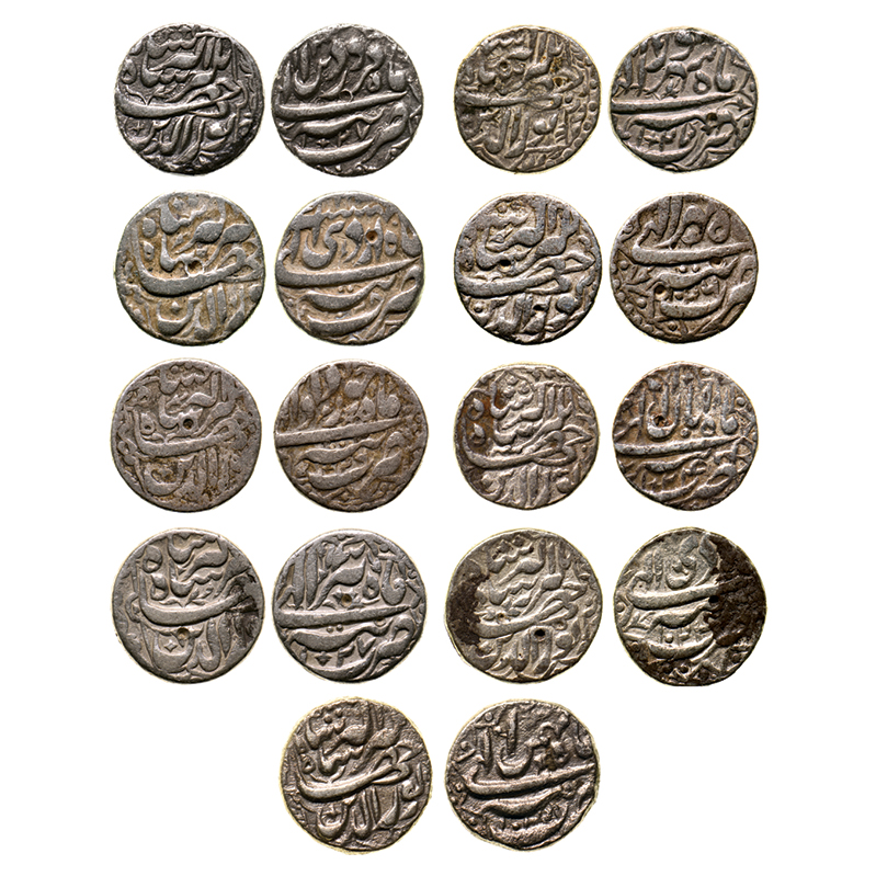 | Jahangir, Silver Rupee (9), Tatta Mint, Ilahi and decorative Type, 9 Different Months. Farwardin 1027/12, Ardibihisht 1028, Khurdad 1026, Tir 1027/13, Shahrewar 1027, Mihr 1026, Di 1024,  Aban 1024/10, Bahman 1028/13. KM 145.17. | Estimate Rs. 38,000-40,000